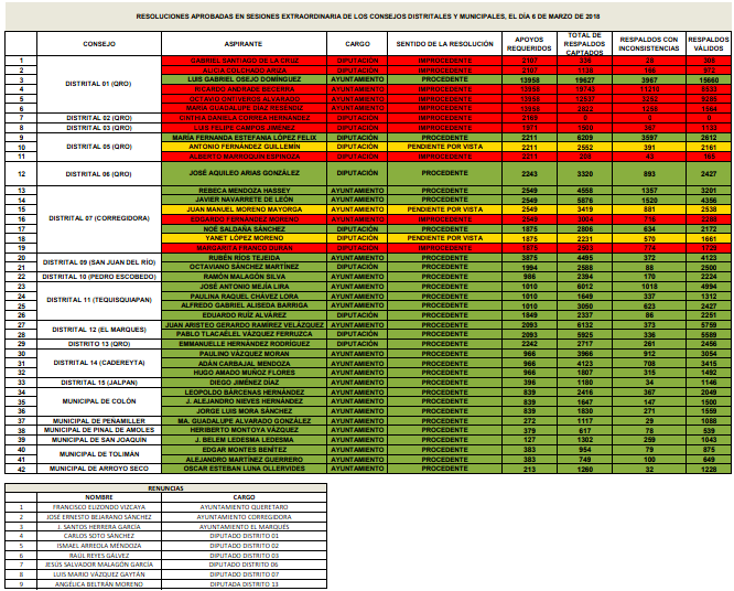 Indicó que las y los aspirantes que cumplieron con el requisito de la obtención del respaldo ciudadano (al menos el 2% de la Lista Nominal de su demarcación) -del 8 de enero al 6 de febrero de 2018- buscan contender en los distritos locales 5, 6, 7, 9, 11, 12 y 13; así como en los municipios de: Arroyo Seco, Cadereyta de Montes (3 aspirantes), Colón (3 aspirantes), Corregidora (2 aspirantes), El Marqués, Jalpan de Serra, Pedro Escobedo, Peñamiller, Pinal de Amoles, Querétaro, San Joaquín, San Juan del Río, Tequisquiapan (3 aspirantes) y Tolimán (2 aspirantes).