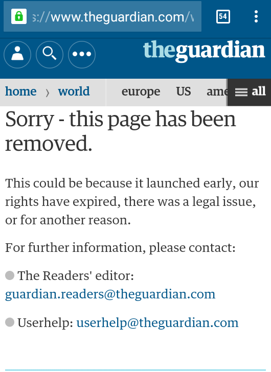 El reportaje no puede ser consultado más en la página del rotativo europeo, pues cuando se consulta la dirección web con la que fue dado de alta el pasado 9 de agosto, aparece un aviso de error.