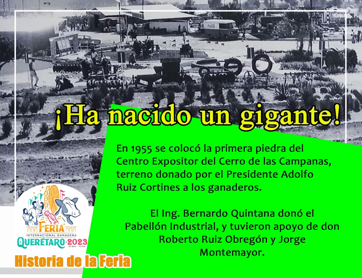 En 1958 se inauguró el nuevo recinto, y en el discurso inaugural, el secretario del Comité Organizador, José María Hernández dijo: “ha nacido un gigante”, profetizando que las exposiciones ganaderas en Querétaro tendrían una trascendencia más allá de nuestras fronteras.