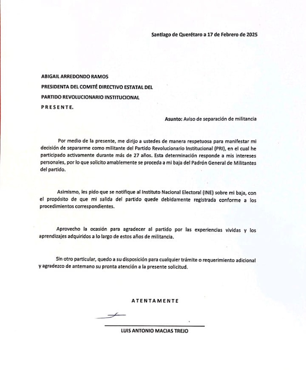 Finalmente, Toño Macías solicitó su baja del padrón de militantes al Comité Directivo Estatal y señaló que desde su trinchera, continuará trabajando para tener un mejor Querétaro.