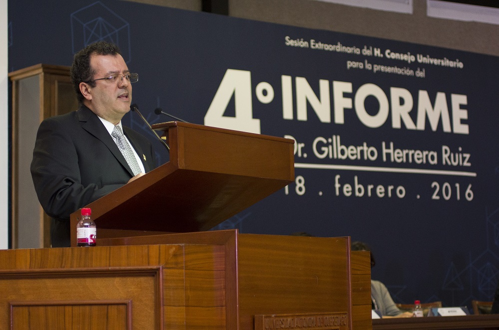 En su cuarto informe de gestión académica y administrativa al frente de la Universidad Autónoma de Querétaro (UAQ), el Dr. Gilberto Herrera Ruiz, detalló los logros alcanzados por la comunidad universitaria que hoy está presente en 12 de los 18 municipios, con el compromiso de extender a toda la población del estado los beneficios del trabajo desplegado.