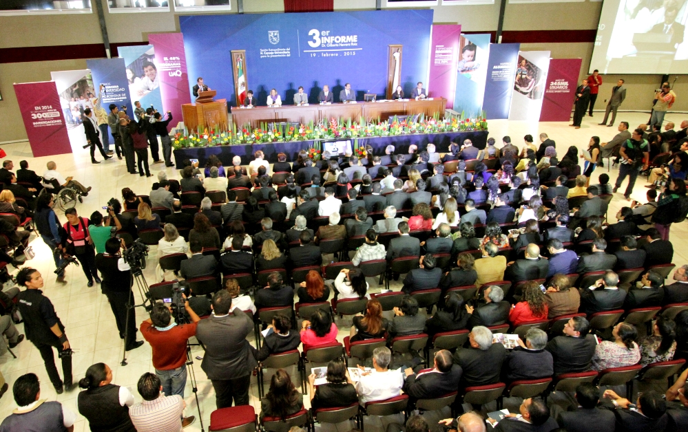 El rector de la Universidad Autónoma de Querétaro (UAQ), Dr. Gilberto Herrera Ruiz, rindió el 3er. Informe de Actividades de su administración, en el que destacó la consolidación de los crecientes indicadores de la calidad educativa con que se posiciona esta Casa de Estudios y subrayó la trascendencia que la educación pública tiene como motor para lograr el desarrollo con equidad y como posibilidad de movilidad social para los ciudadanos.
