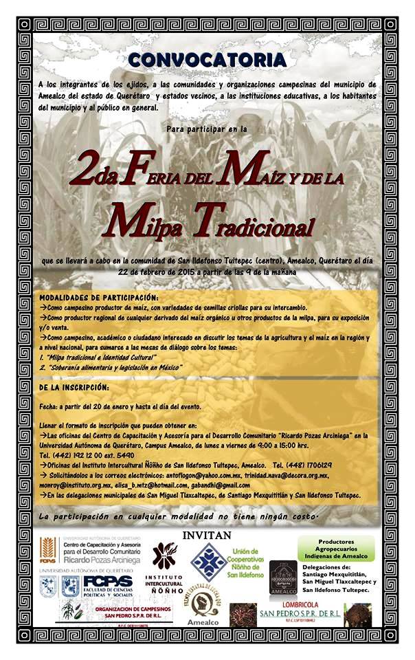 La Universidad Autónoma de Querétaro, a través de la Facultad de Ciencias Políticas y Sociales (FCPS), impulsa la realización de la 2da. Feria del Maíz y de la Milpa Tradicional que se celebrará el próximo 22 de febrero, a partir de las 9:00 horas en el centro de San Ildefonso Tultepec, comunidad de Amealco de Bonfil.