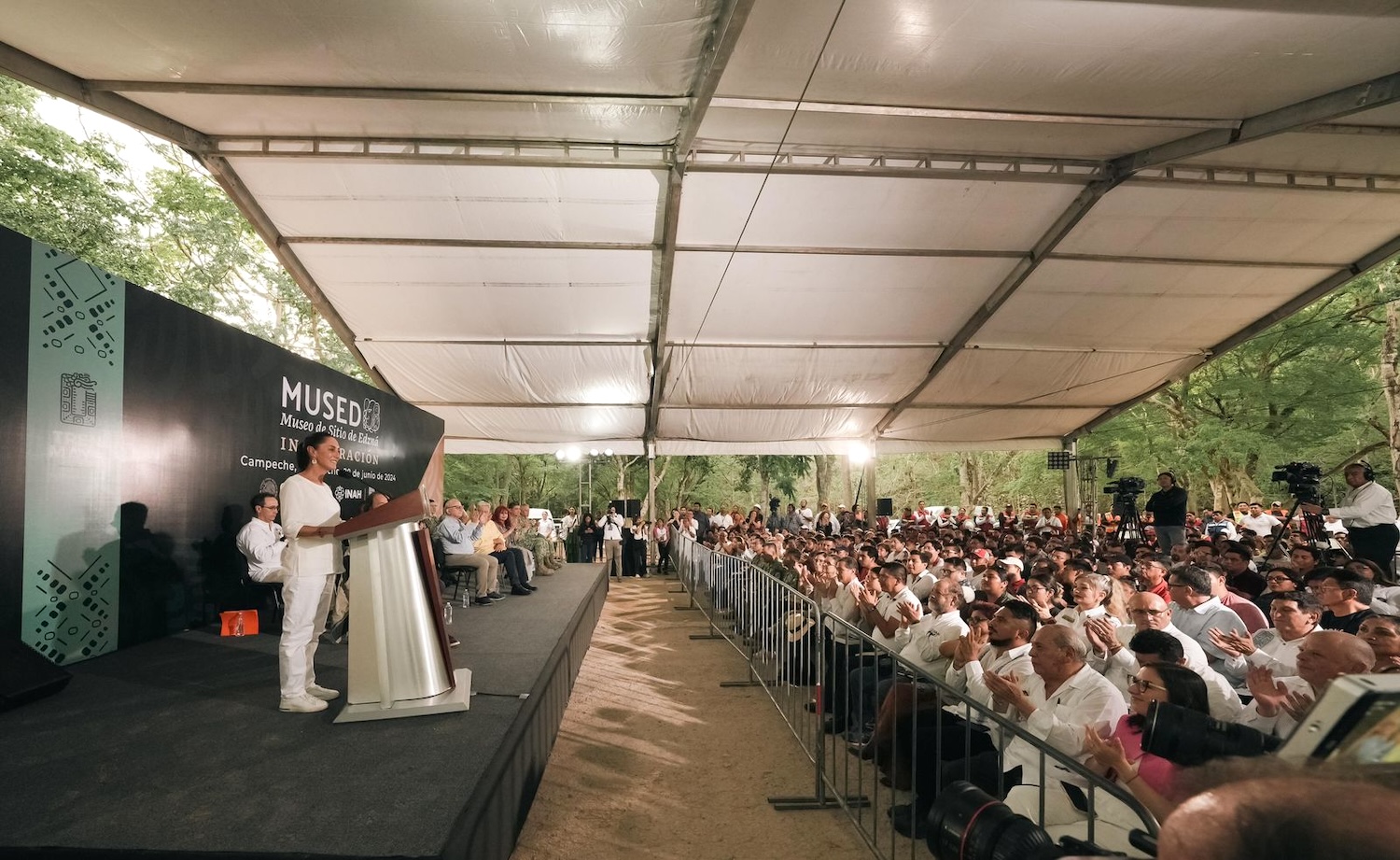 “Vamos a dar continuidad al Tren Maya, a los planes de justicia, a seguir rescatando estos hermosos sitios arqueológicos, la atención y construcción de nuestro destino junto a nuestro pueblo diverso y alegre’’, fue el compromiso de Claudia Sheinbaum, virtual presidenta electa, durante la inauguración de Mused, museo de sitio de Edzná, en donde recalcó que consolidar la obras y proyectos de la Cuarta Transformación fue lo que eligió el pueblo de México en las pasadas elecciones.