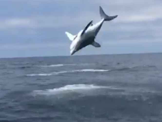 Tal como si se tratara de un delfín, el depredador realizó varias piruetas en el aire, cautivando a sus espectadores con un acto único en su tipo.