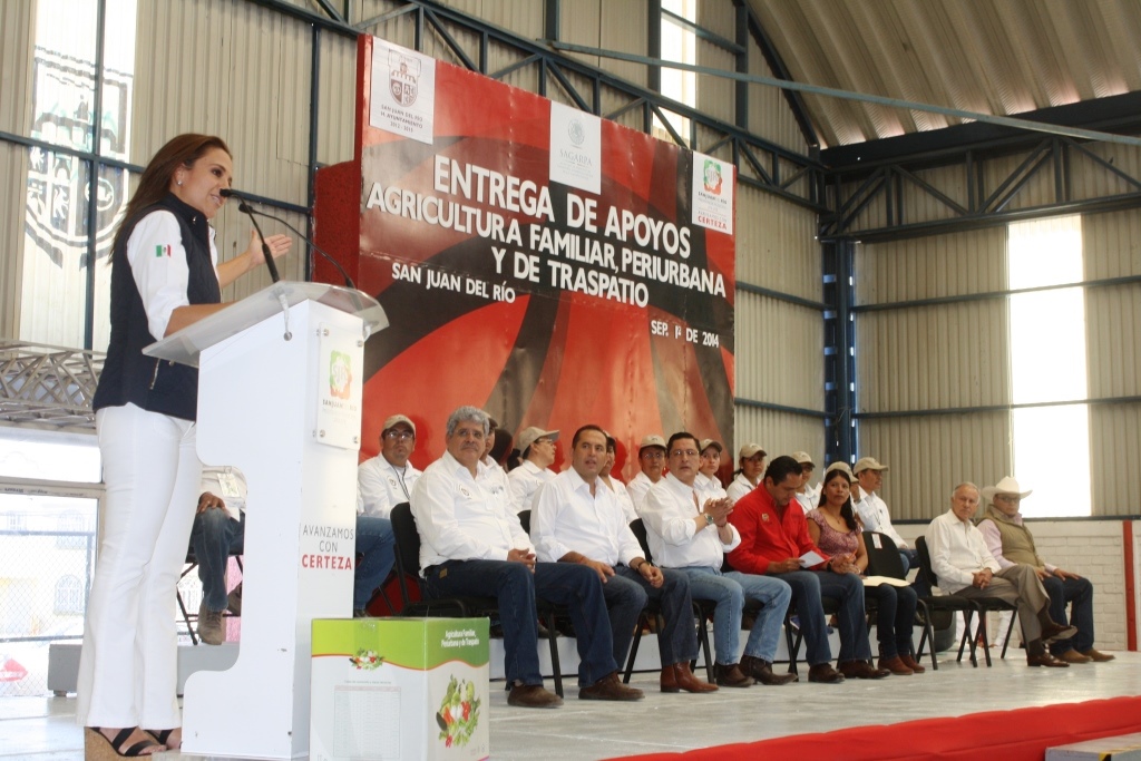 En el marco de la entrega de apoyos para agricultura familiar, periurbana y de traspatio que efectuó la delegación estatal de la Secretaría de Agricultura Secretaría de Agricultura, Ganadería, Desarrollo Rural, Pesca y Alimentación (SAGARPA), la coordinadora regional del programa estatal Soluciones, Tania Ruiz Castro, destacó que a dos años del actual Gobierno federal, la política social del Presidente de México, Enrique Peña Nieto, está vigente en San Juan del Río a través de la Cruzada Nacional Contra el Hambre.