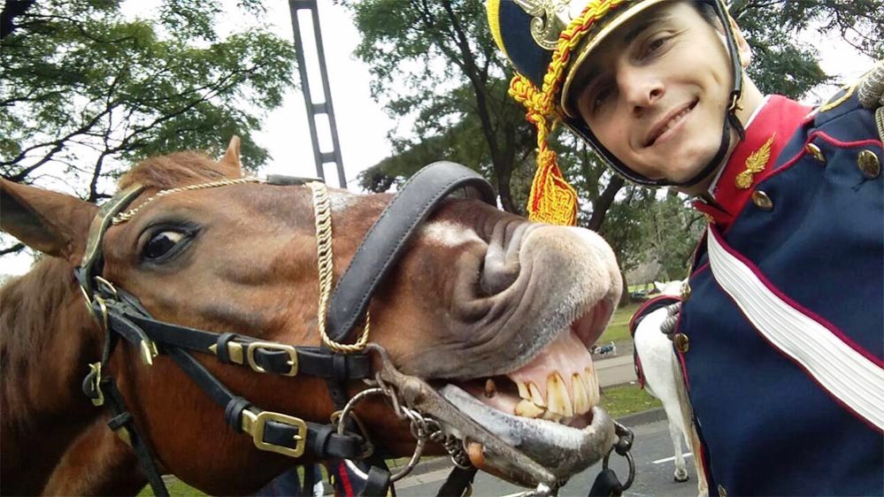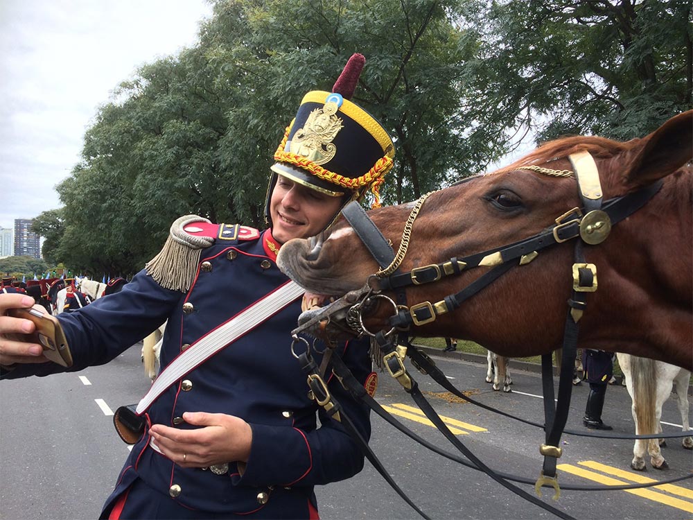 Previo al desfile militar, que tuvo un recorrido por la Avenida Libertador, en el barrio porteño de Palermo, uno de los uniformados se salió del protocolo y se sacó una foto con su fiel corcel.